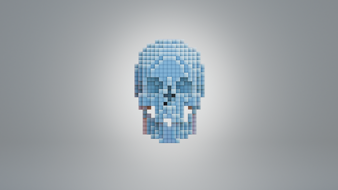 A symphony of vibrant pixels. They converge, assembling into a 3D mosaic that takes the form of a human skull, symbol of vanities in our digital era.